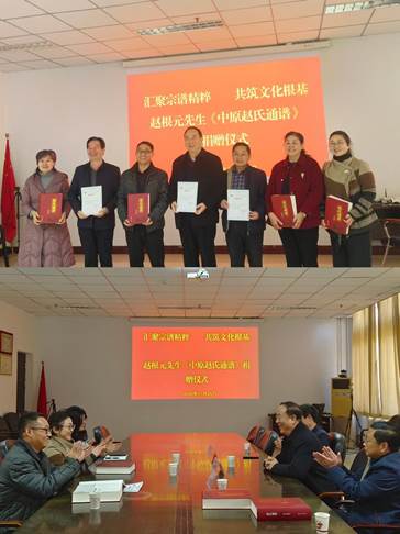 捐赠仪式上,赵根元先生对所赠图书进行了简要介绍。该书系统梳理了中原赵氏历史,分溯源、世系、文献三部分,汇集了濒危谱牒碑刻,是研究传承赵氏文化与家族精神的重要文献,具有重要的学术价值和传承意义。蒋剑虹从寻根溯源角度,认为该书为追溯文化源流、连接历史记忆提供了珍贵载体;武宗锋从文献贡献角度出发,表示该书不仅传承了历史文化,还赓续了中华民族精神血脉,图书馆将秉持“藏以致用、传以永续”的原则,确保其文化内涵与史料价值在传播与存续中得以充分彰显。